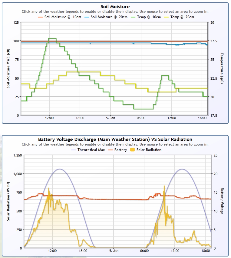 After adding soil, leaf and air quality sensors to my WeatherDuino Pro2+ system, I wanted to get the data not only displayed as numbers on my website, but also graphed using HighCharts or JPGraphs. By doing this I have more control over how the data is displayed and not relying on an external graphing website.