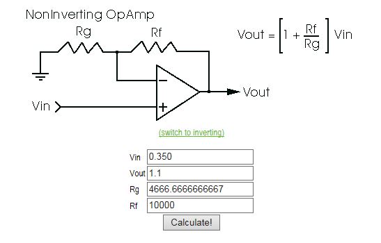 (12-10-2017, 10:33)AllyCat Wrote: I believe to give "full scale" with the 1.1 volts nominal reference voltage of the Nano needs a gain of 3.667, which I calculate requires 3.75 kohms. With the wiper at "end of track" (5 kohms) the gain should be close to 3 to give a "full scale" (limiting) ADC reading at around 1833 Watt/m2 (I don't know what scale factor the software uses).