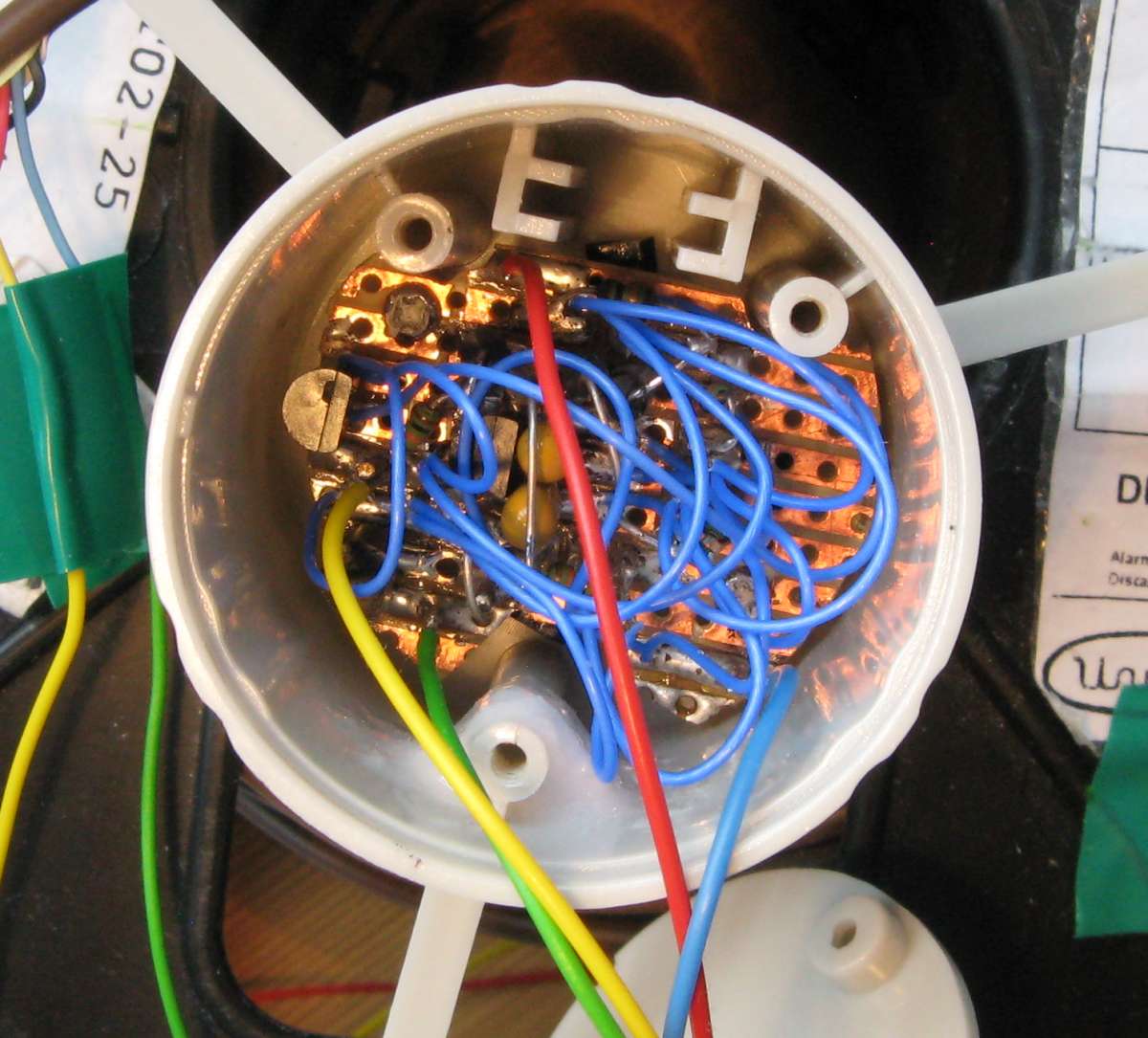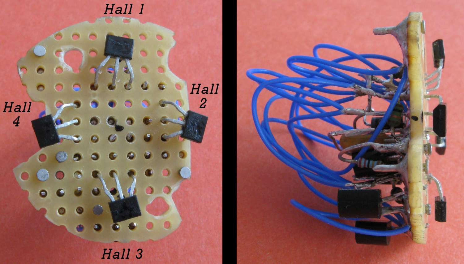 For ease of removal 4 Hall effect sensors (Honeywell SS443) spaced 90 degrees apart around a 40mm radius, are soldered to a piece of veroboard that contains 2 holes that align with the existing reed switch mounting points. The Hall sensors are electrically linked in an AND gate configuration using 4 diodes and a resistor.