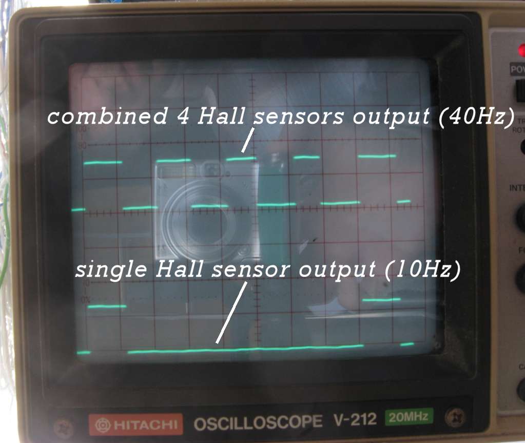 If any of the Hall sensors goes logic low (when it senses a magnetic field above its specified threshold) the AND gate output goes low. The signal is sent down a wired connection via an open collector transistor, and, as the attached oscilloscope photo shows, works fine over a 60 meter cable run with a 'hairdryer blowing on cups simulated' wind speed of about 25mph. The wired connection also includes the output from a single Hall sensor (as shown on the oscilloscope trace) just in case it's needed. By positioning the Hall sensors 90 degrees apart (and with a little positional tweeking) there can be equal logic high and logic low signals from the AND gate output across a 360 degree anemometer cups revolution.
