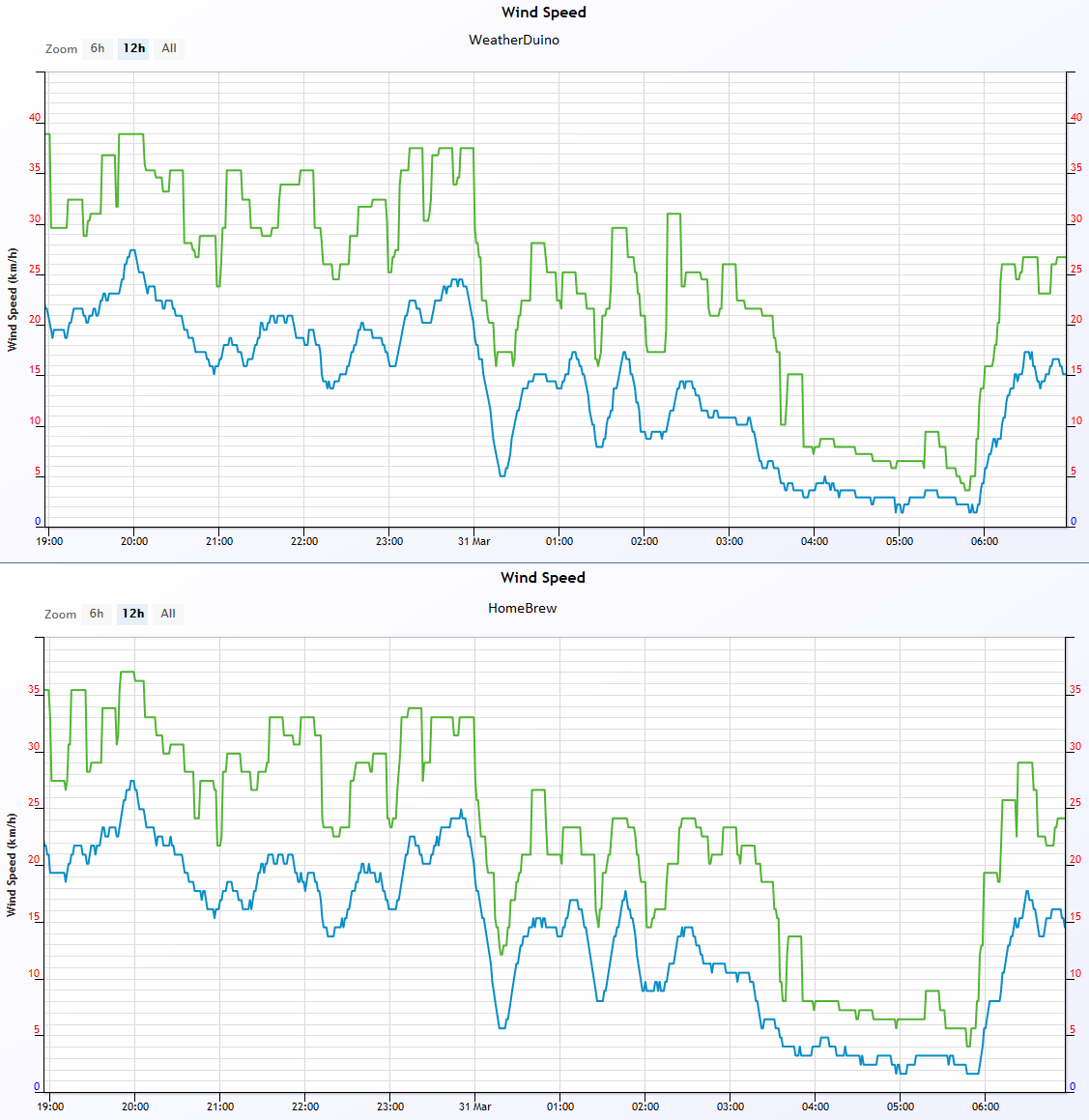 WeatherDuino gusts are consistently slightly higher than the alternative.