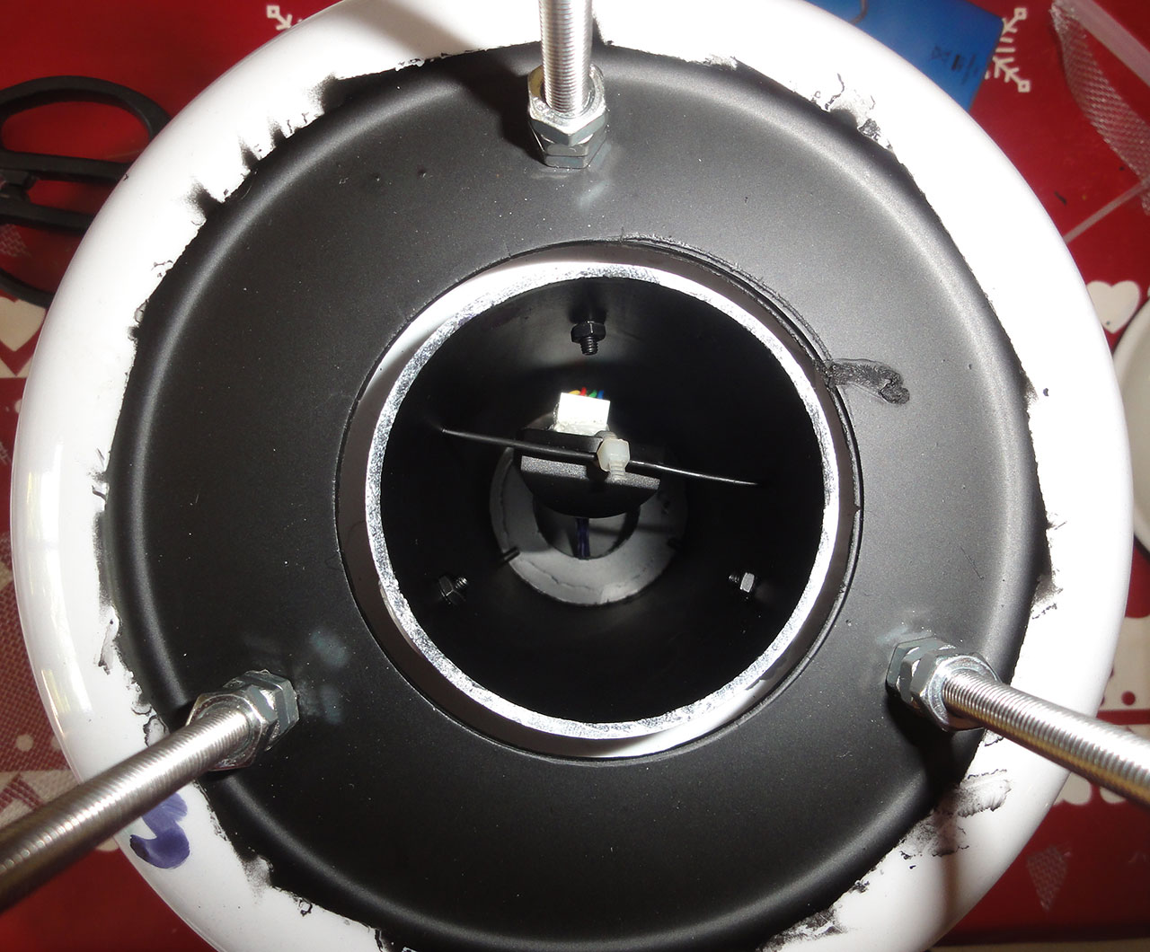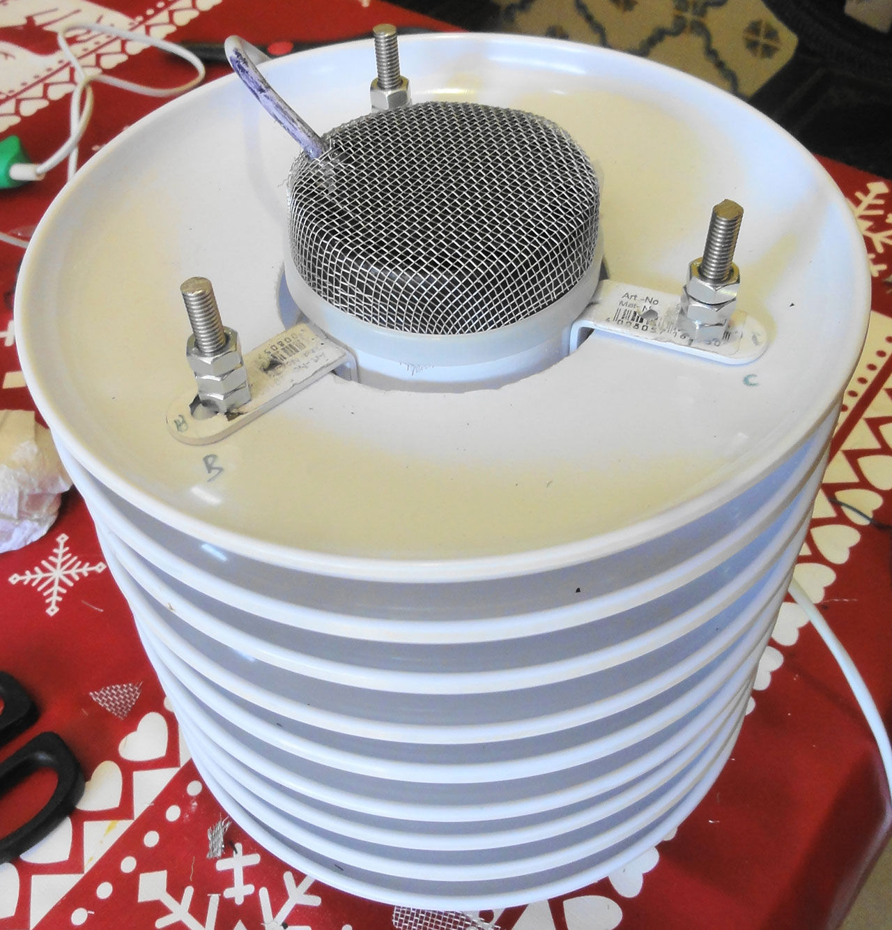 This includes a remake to the original radiation shield, made out of 11 melamine dishes (it's missing the top and bottom plates in the pic.s) and now with a 24/24h running fan aspiring a 6cm diameter PVC tube housing the temp/hum sensor. I tried keeping the light/radiation out by using a telescope like dampening system where the air enters laterally facing a ring.