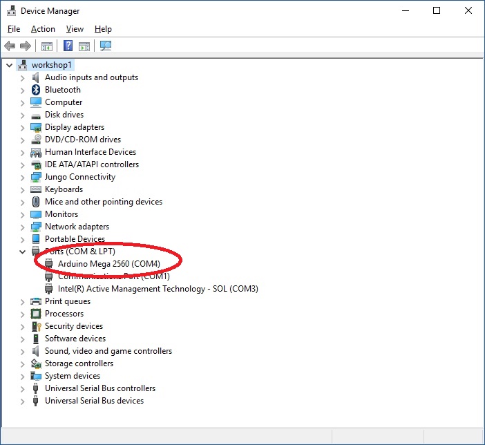 If your device driver has loaded correctly, you should see a “port” number next to the “Arduino Mega 2560” device.  In the example above the device driver has linked the Ardunio Mega to COM4 on my computer.  You will need this information later for the Ardunio IDE software in order to tell it where to find the Arduino Mega 2560 module.
