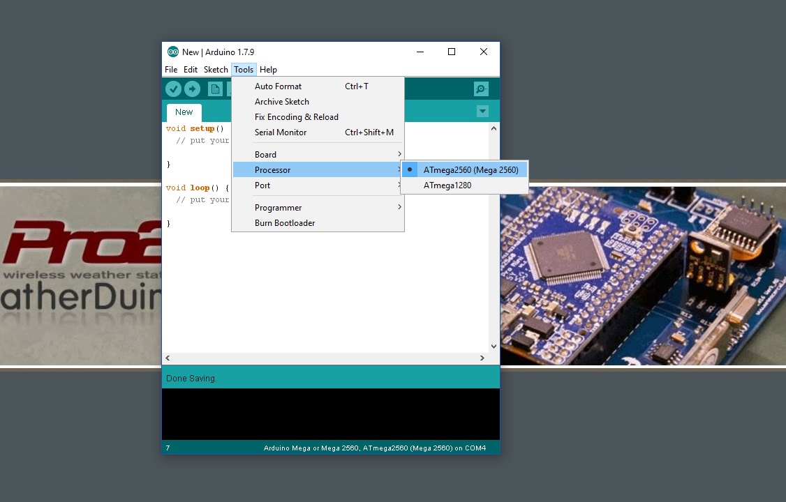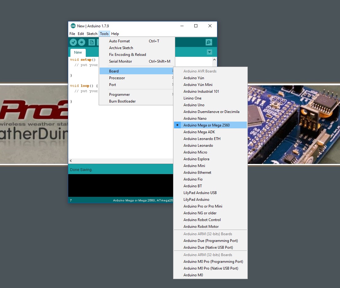 As you may have noticed already, the new WeatherDuino Pro2 PLUS receiver station uses a new processor module.  The new processor module looks a little different to the old Arduino Nano that we have been using for some time with WeatherDuino.  The new processor module for the receiver station is the Meduino Mega2560 Pro Mini (Note - the transmitter and the wireless display still use the Arduino Nano module).
