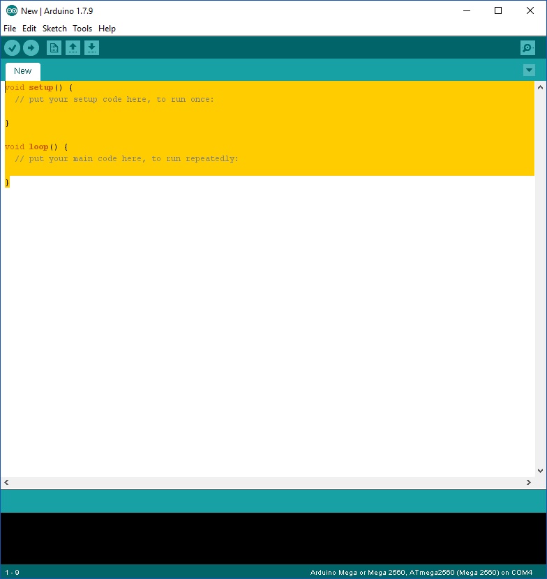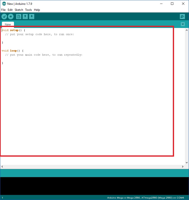 Now we need to program the Arduino Mega 2560 module with a simply program to test it out and confirm that it is functioning correctly.  The Arduino modules have an onboard LED which is connected to digital pin 13 and this is convenient for testing our module.  In the IDE software (editor) the lower section is where you write your sketch or program, before uploading it into your Arduino Mega 2560 module.