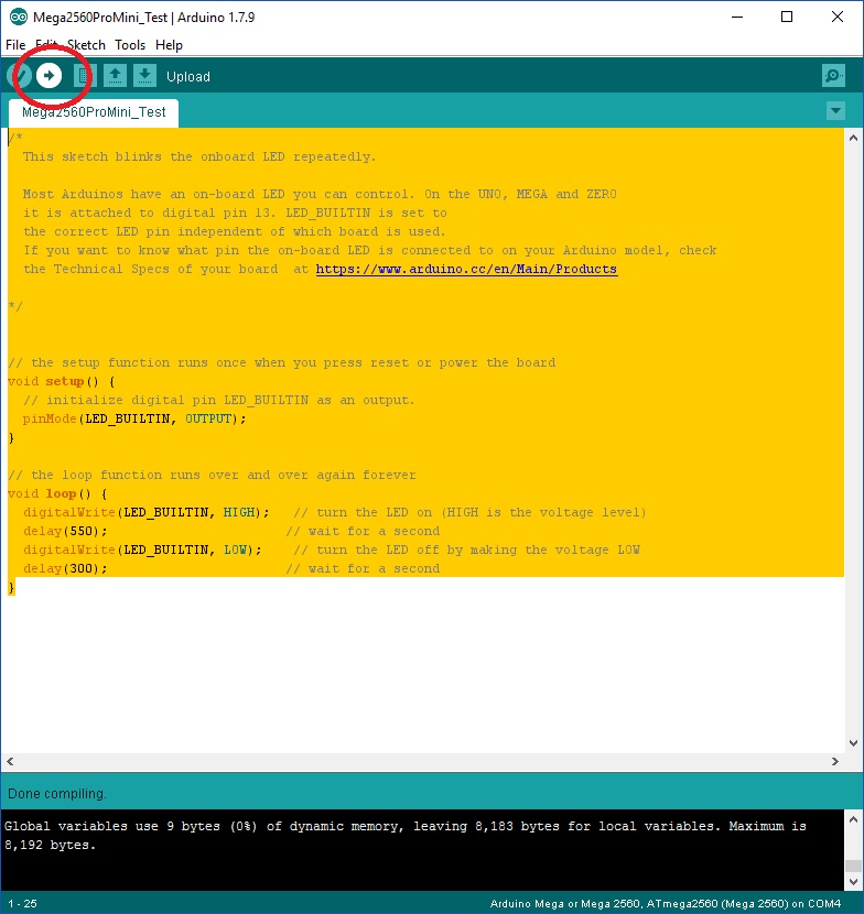 Now we load the sketch into the your Arduino Mega 2560 module.  To do this we simply click the ‘Upload’ button (which looks like a little ‘ARROW’ pointing to the right).