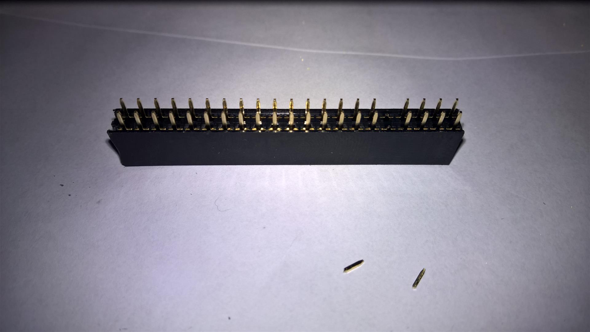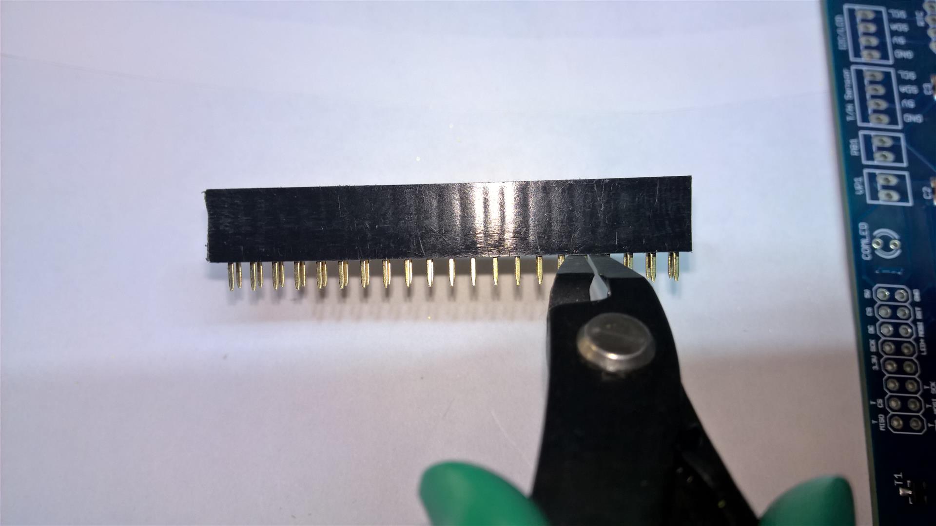 Once you have then trimmed to size, you will want to cut out the 'fifth' pin on one of the strips, so that it will fit onto the PCB.  I think this is easier than cutting into two sections, but the choice is yours.