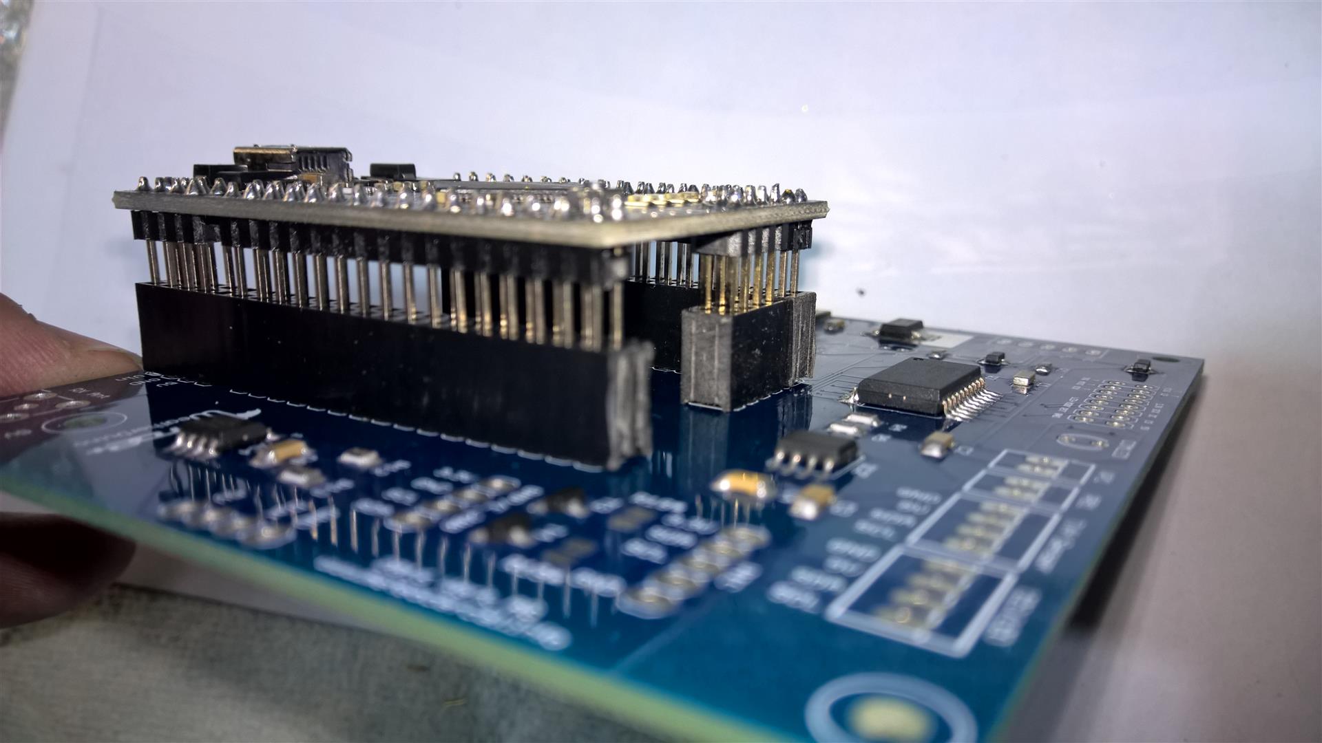 Now we need to insert the headers and make sure they don't move while we 'tack' the end pins into place.  I lightly insert the processor module into the header sockets and this will both align the headers and hold them into place.  As we did when soldering the headrers onto the processor, solder the two opposite end pins of each header socket to hold it in place.  Then remove the processor module and proceed to solder the alternate pins of the header sockets as outlined above.